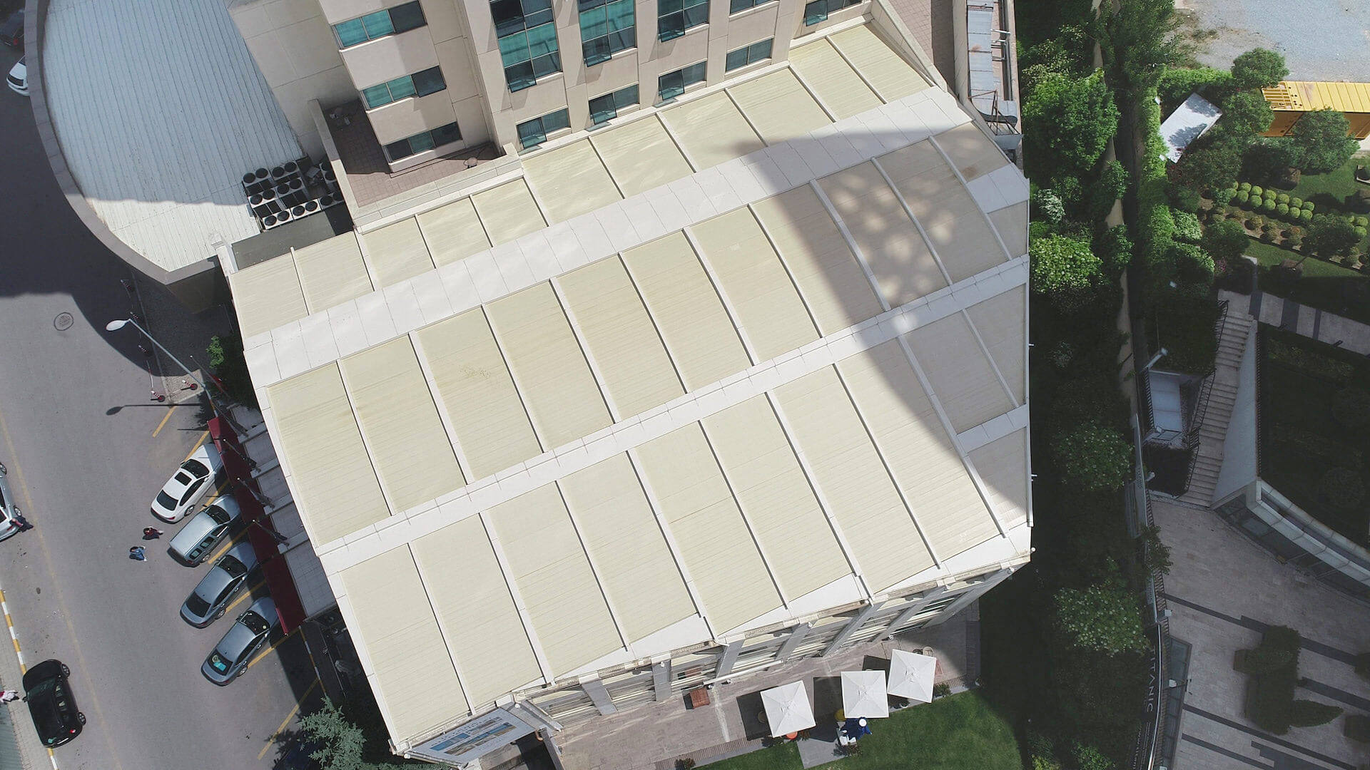 הגוף של הפרגולה הוא מקונצטרוקציה אלומיניום והכיסוי שלה הוא מיריעות PVC, נגד גשם עם תאורה של לדים סמסונג ומרזיבים סמויים בתוך העמודים.